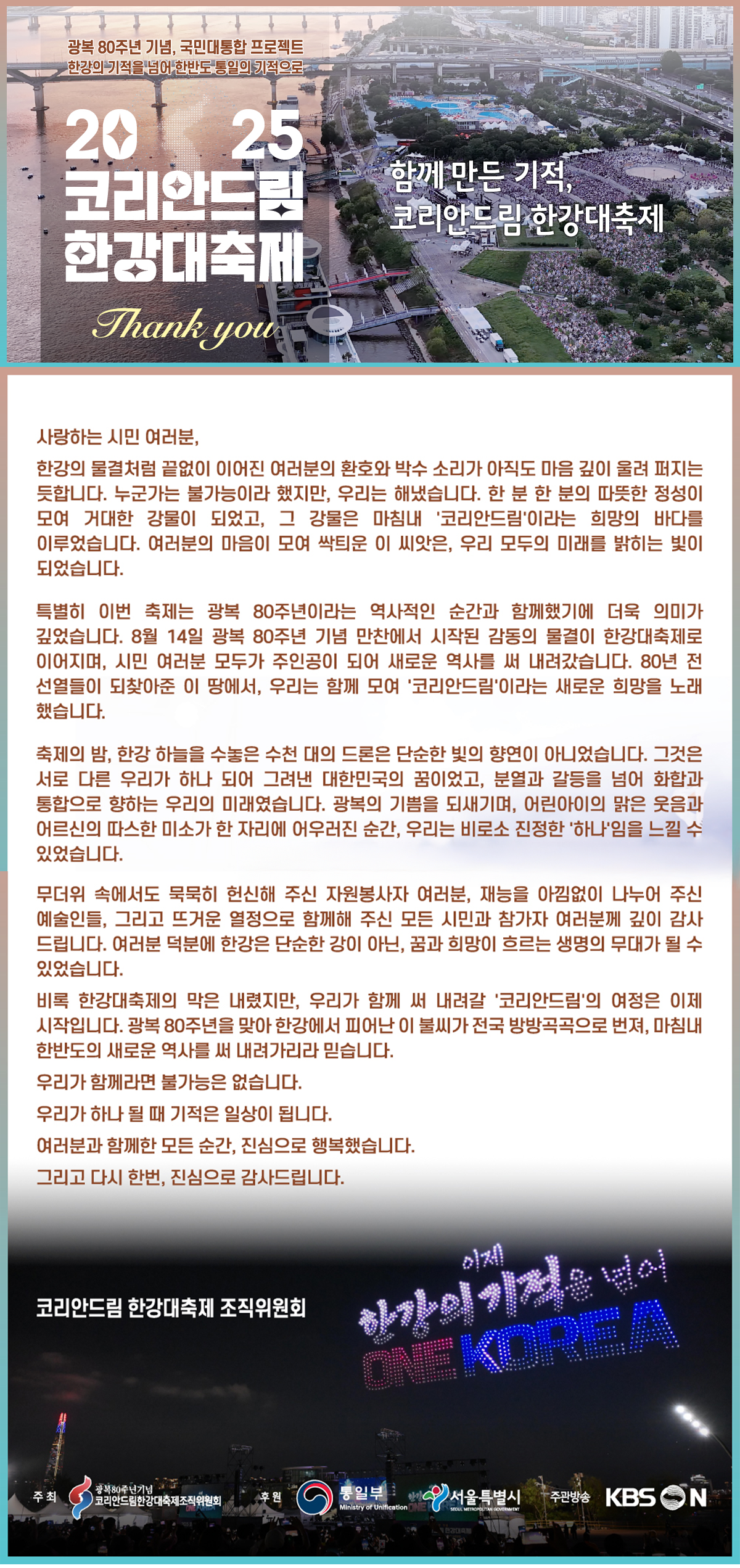 광복 80주년을 맞이하여 한강에서 열릴 코리안드림한강대축제는 국민대통합과 통일에 대한 비전을 함께 나누는 역사적인 자리가 될 것입니다.